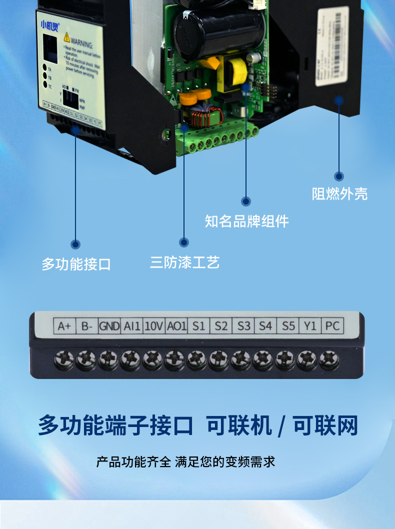 JL10變頻器新品上市,處處是升級,產品身材更小,正面觀看和一部普通智能手機的大小相似。產品雖小,功能齊全。多功能端子接口可聯(lián)機/可聯(lián)網(wǎng),產品外殼采用阻燃材料,耐高溫。